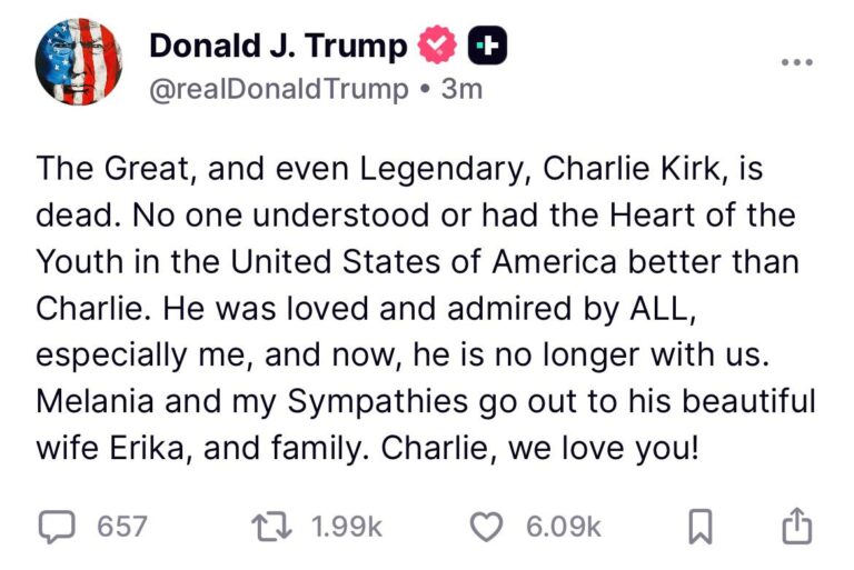 Former President Donald Trump has publicly mourned the death of Charlie Kirk, the prominent conservative activist and founder of Turning Point USA, in a post on his Truth Social platform. Trump described Kirk as “Great, and even Legendary,” praising his unique connection to American youth and expressing deep personal admiration. The former president extended condolences […]
